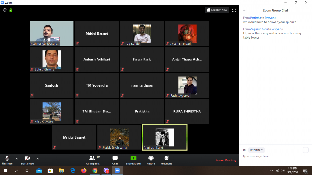 Since the last five weeks a few days after the lock down here in Nepal, Toastmaster Shaurab Lohani came up with this excellent idea of starting virtual yoga classes in the morning as we had successfully started online Toastmasters meeting using zoom. This was discussed in our informal Whatsapp group and since then, we have […]
